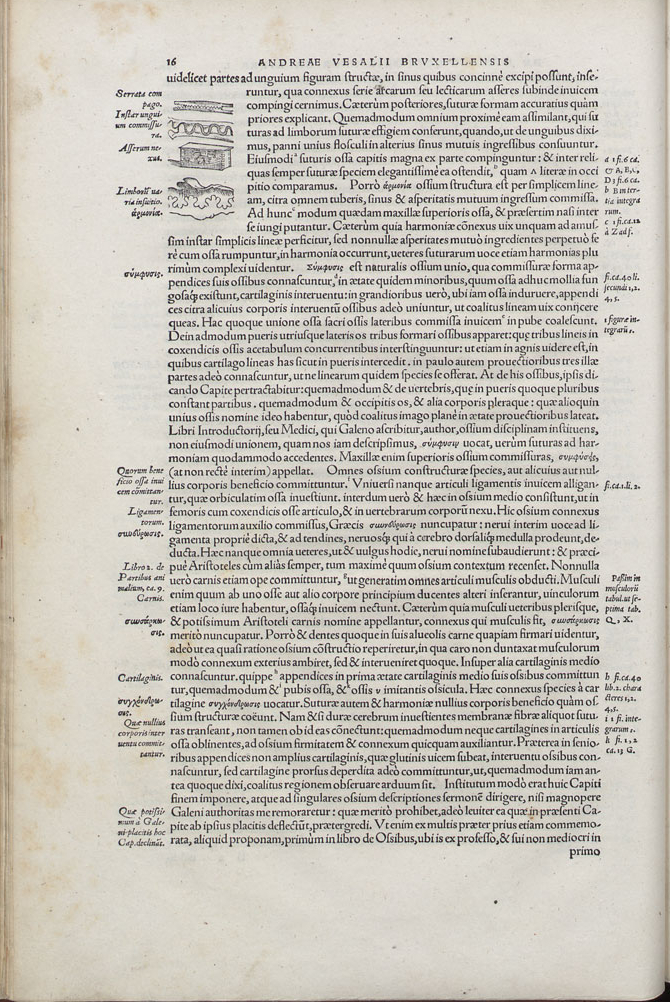 didactiekN° de page/feuillet : p. 16 Format et dimension : Folio Technique : Gravure sur bois - Houtgravure Mise en couleur : Noir et blanc - Zwart en wit Légende : Serrata compago. Instar unguium commissura. Asserum nexus. Limborum varia insuitio. Langues : Latin (lat) Catégories : Iconografie:Geneeskunde:Anatomie